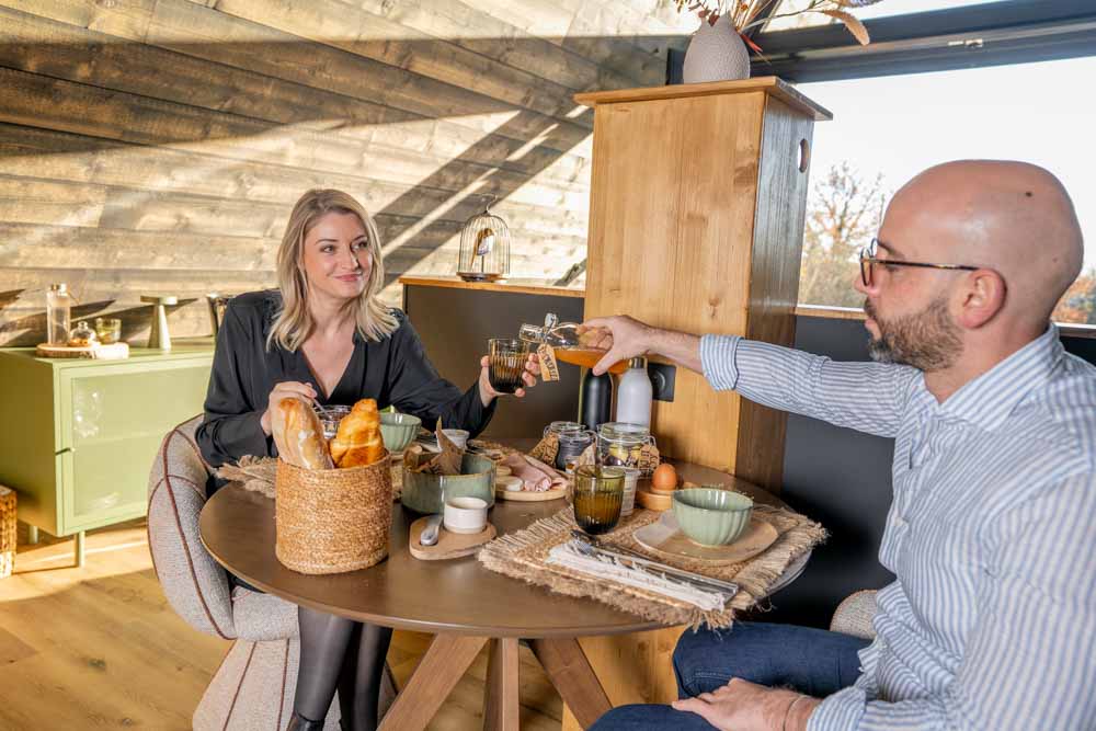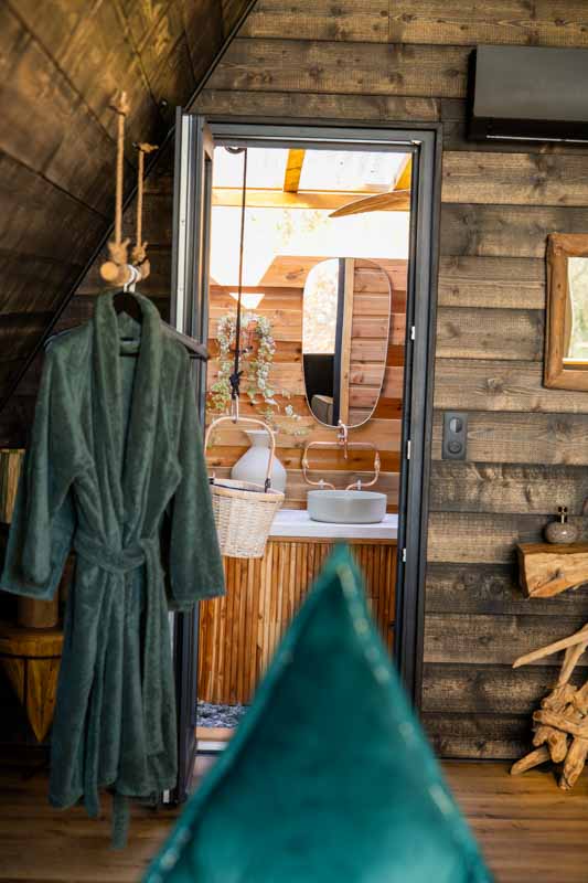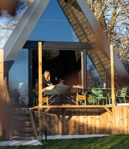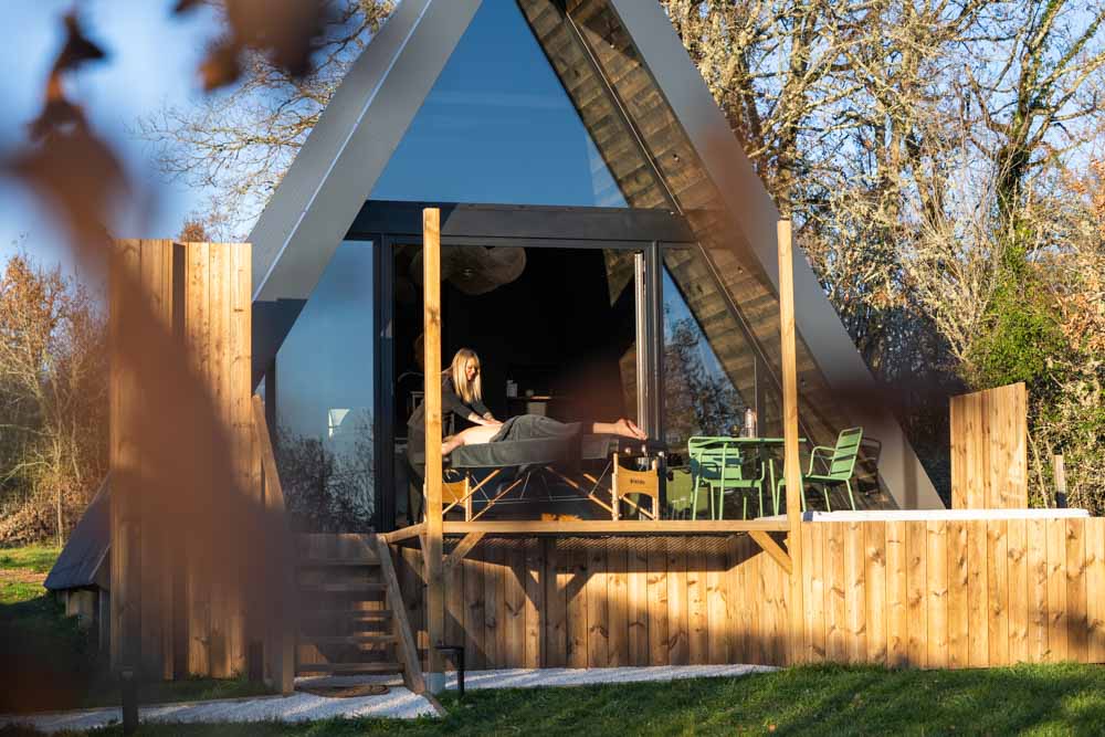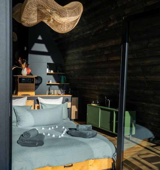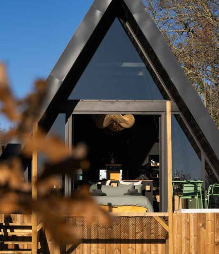 Sur les hauteurs de Souillac, la cabane L’Atypique séduit par son architecture triangulaire unique et son atmosphère chaleureuse. Conçue comme un véritable cocon pour deux, elle allie design moderne et authenticité, avec ses grandes baies vitrées qui ouvrent la vue sur l’extérieur tout en laissant entrer la lumière naturelle.