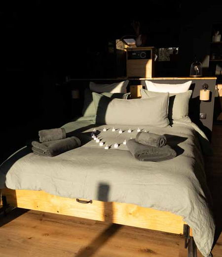 À l’intérieur, chaque détail a été pensé pour votre confort : un lit douillet et lit coulissant vers l’extérieur, pour savourer la douceur du matin ou s’endormir sous les étoiles 🌙.