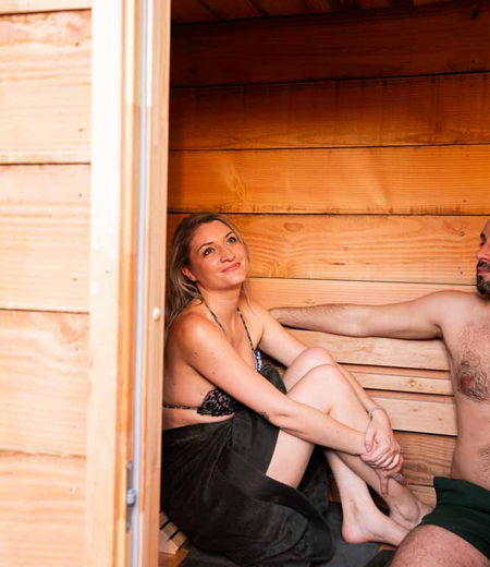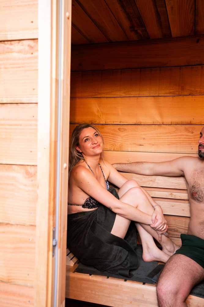 À l’extérieur, la salle de bain se prolonge par un sauna privatif en bois clair, parfait pour une parenthèse détente en toute intimité.